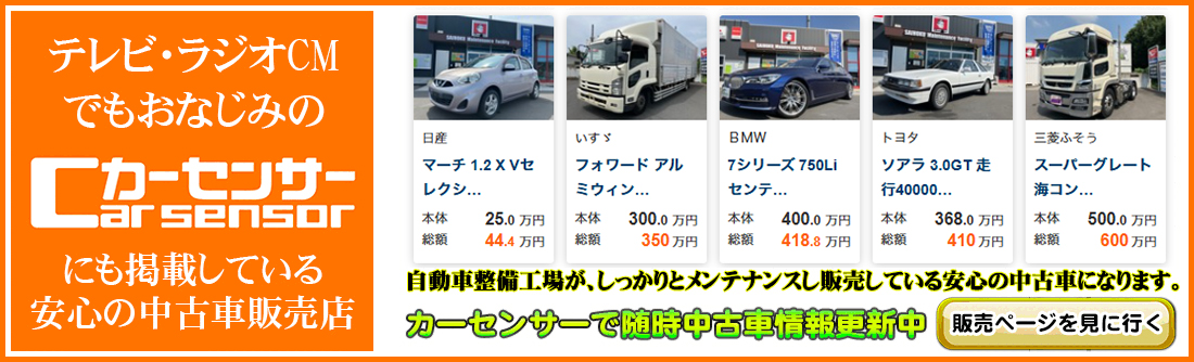 整備工場がしっかり車体をチェックし安心安全の中古車を販売しております。皆様おなじみのカーセンサーに随時最新中古車情報を掲載しております。